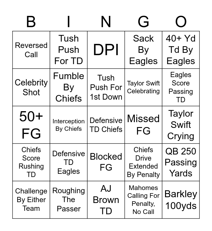 This bingo card has 25 words: Defensive TD Eagles, AJ Brown TD, Tush Push For 1st Down, Challenge By Either Team, 40+ Yd Td By Eagles, Reversed Call, Celebrity Shot, Tush Push For TD, Missed FG, Blocked FG, Taylor Swift Celebrating, 50+ FG, Chiefs Drive Extended By Penalty, QB 250 Passing Yards, Fumble By Chiefs, Barkley 100yds, Taylor Swift Crying, DPI, Eagles Score Passing TD, Interception By Chiefs, Defensive TD Chiefs, Roughing The Passer, Chiefs Score Rushing TD, Sack By Eagles and Mahomes Calling For Penalty, No Call.