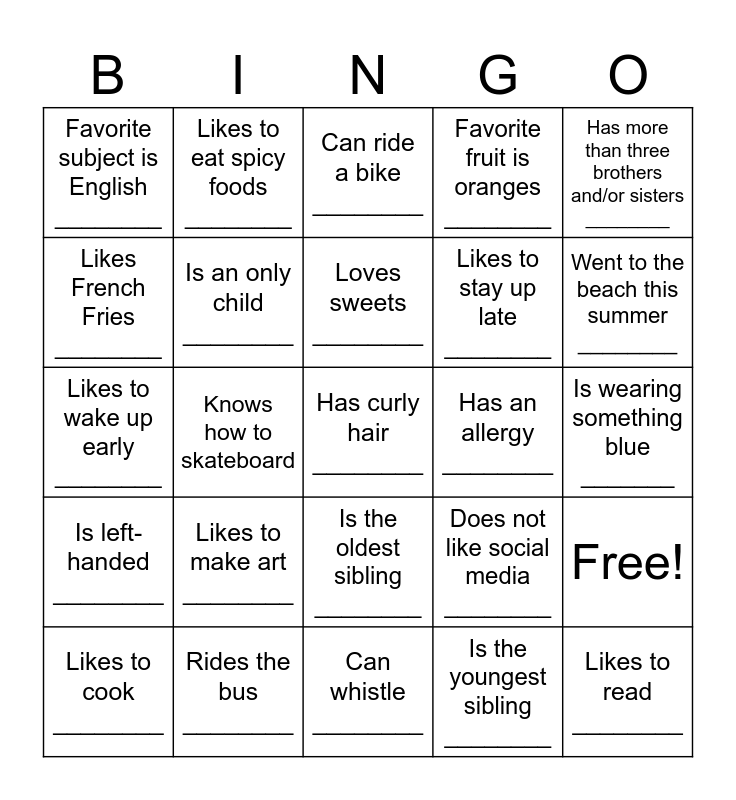 This bingo card has 26 words: Is the oldest sibling ________, Is the youngest sibling ________, Loves sweets ________, Rides the bus ________, Has more than three brothers and/or sisters ________, Favorite subject is English ________, Likes French Fries ________, Likes to eat spicy foods ________, Is wearing something blue _______, Does not like social media ________, Likes to stay up late ________, Likes to wake up early ________, Free!, Likes to cook ________, Knows how to skateboard, Is wearing something red ________, Favorite fruit is oranges ________, Is left-handed ________, Can ride a bike ________, Has curly hair ________, Went to the beach this summer ________, Can whistle ________, Has an allergy ________, Likes to make art ________, Is an only child ________ and Likes to read ________.