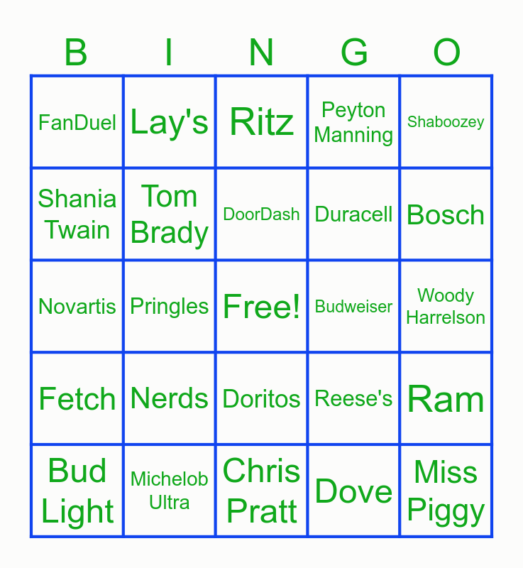 This bingo card has a free space and 49 words: Angel Soft, Miss Piggy, Little Ceasars, Chris Pratt, Nerds, Jeep, Lay's, Tubi, Shania Twain, Cirkul, Tom Brady, Peyton Manning, Ram, Reese's, Charlie XCX, Martha Stewart, DoorDash, Budweiser, Coors Light, Shaboozey, Pringles, Dove, FanDuel, Duracell, Booking.Com, Bosch, Bud Light, Coffee Mate, Doritos, Fetch, Adam Devine, Kermit the Frog, Liquid Death, Meta, Michelob Ultra, Chris Hemsworth, Orlando Bloom, Doja Cat, Woody Harrelson, TurboTax, Uber Eats, Him & Hers, GoDaddy, Mountain Dew, Novartis, Ritz, Skechers, Stella Artois and Taco Bell.