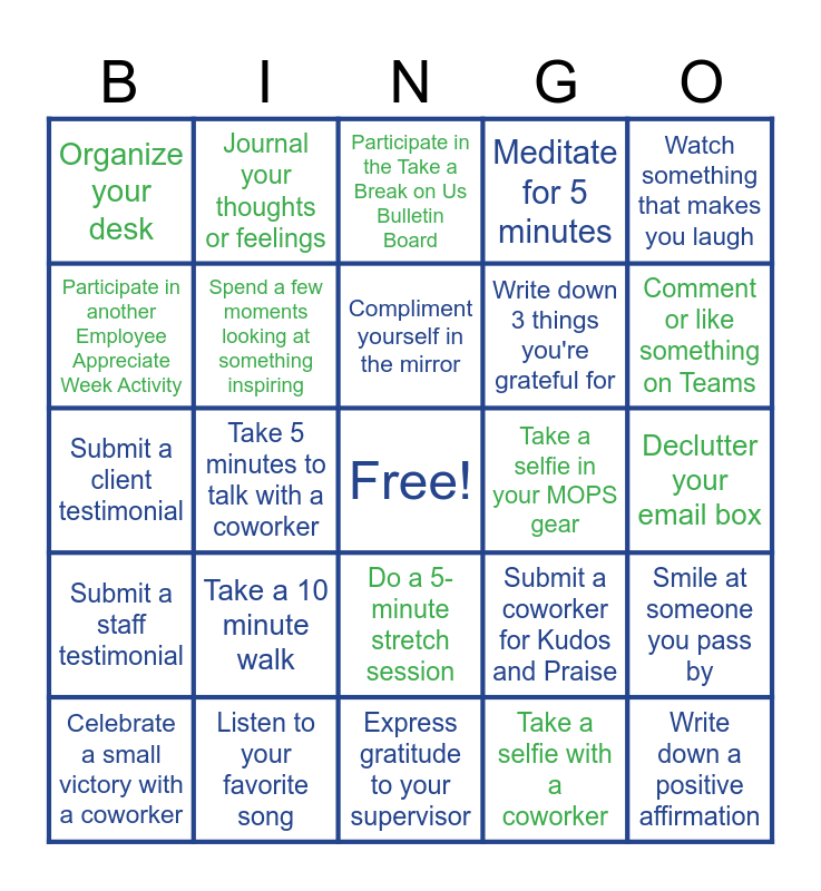 This bingo card has a free space and 24 words: Take a 10 minute walk, Listen to your favorite song, Compliment yourself in the mirror, Celebrate a small victory with a coworker, Watch something that makes you laugh, Organize your desk, Participate in another Employee Appreciate Week Activity, Journal your thoughts or feelings, Take a selfie in your MOPS gear, Do a 5-minute stretch session, Write down 3 things you're grateful for, Submit a client testimonial, Submit a coworker for Kudos and Praise, Smile at someone you pass by, Spend a few moments looking at something inspiring, Take a selfie with a coworker, Declutter your email box, Participate in the Take a Break on Us Bulletin Board, Comment or like something on Teams, Take 5 minutes to talk with a coworker, Write down a positive affirmation, Submit a staff testimonial, Meditate for 5 minutes and Express gratitude to your supervisor.