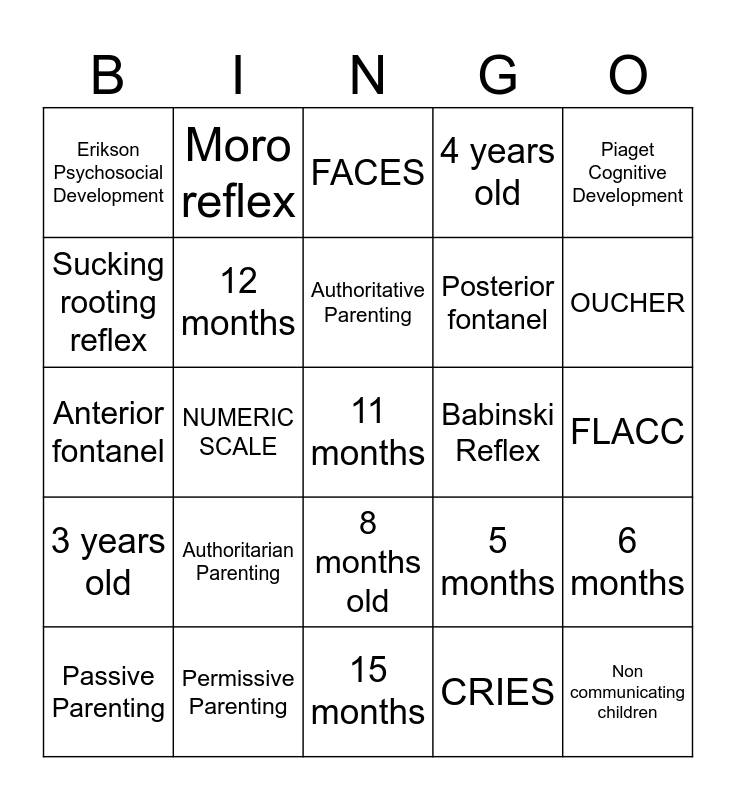 This bingo card has a free space and 24 words: Authoritarian Parenting, Permissive Parenting, Authoritative Parenting, Passive Parenting, Piaget Cognitive Development, Erikson Psychosocial Development, Sucking rooting reflex, Moro reflex, Babinski Reflex, 8 months old, Posterior fontanel, Anterior fontanel, 5 months, 6 months, 12 months, CRIES, FLACC, FACES, OUCHER, NUMERIC SCALE, Non communicating children, 3 years old, 4 years old and 15 months.