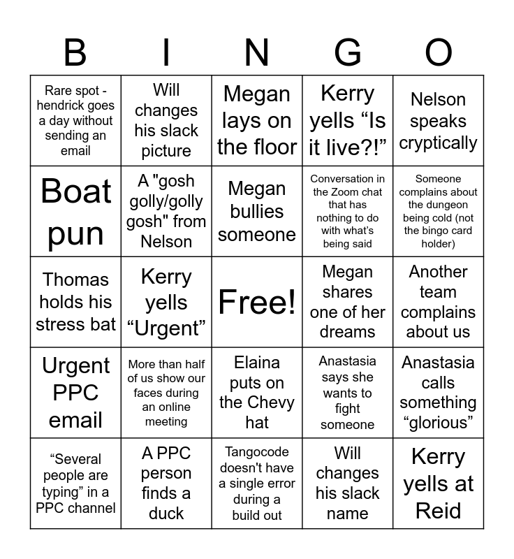This bingo card has a free space and 41 words: Anastasia on a Wednesday with a cane, Thomas holds his stress bat, Thomas flails his arms around in a meeting, A "gosh golly/golly gosh" from Nelson, A PPC person finds a duck, Elaina puts on the Chevy hat, Megan bullies someone, Megan says Chevy Strong, Nelson speaks cryptically, Urgent PPC email, Kerry yells “Urgent”, Kerry yells “Is it live?!”, Kerry yells at Reid, Another team complains about us, Megan shares one of her dreams, More than half of us show our faces during an online meeting, Hendrick email, Rare spot - hendrick goes a day without sending an email, Thomas asks an ice breaker question, Megan lays on the floor, Anastasia calls something “glorious”, More than one pet makes a guest appearance during a meeting, Tangocode doesn't have a single error during a build out, Conversation in the Zoom chat that has nothing to do with what’s being said, Elaina uses 3 or more exclamation points in one message, Hannah talks about astrology, Will changes his slack name, Jasmine creates a Notion page, Someone complains about the dungeon being cold (not the bingo card holder), Thomas says “shore things up/shore up”, Someone types in ALL CAPS in a PPC channel, Will changes his slack picture, “Several people are typing” in a PPC channel, Someone sits in a chair Sonya has sat in (because it’s so low), Anastasia says she wants to fight someone, Boat pun, Thomas says something in a funny voice, Niamh says “hot take”, Someone is illiterate, Anytime someone calls for Kim and Kailyn walks in with Starbucks.