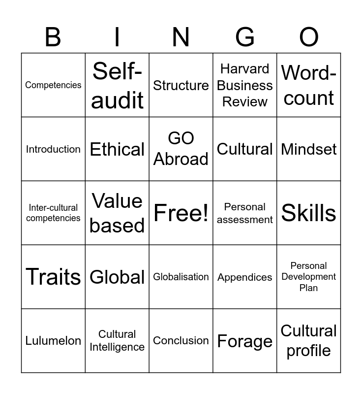 This bingo card has a free space and 24 words: Global, Cultural Intelligence, GO Abroad, Lulumelon, Word-count, Competencies, Introduction, Self-audit, Personal assessment, Globalisation, Cultural, Inter-cultural competencies, Appendices, Personal Development Plan, Ethical, Forage, Skills, Structure, Mindset, Value based, Cultural profile, Traits, Harvard Business Review and Conclusion.