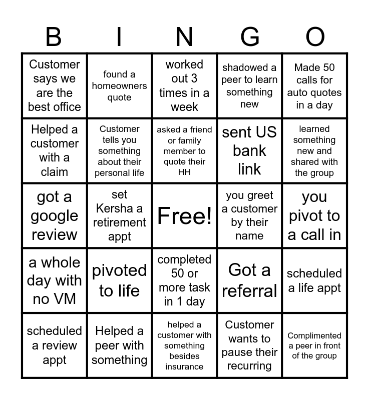 This bingo card has a free space and 24 words: scheduled a review appt, pivoted to life, asked a friend or family member to quote their HH, Customer wants to pause their recurring, Made 50 calls for auto quotes in a day, Customer says we are the best office, found a homeowners quote, worked out 3 times in a week, you greet a customer by their name, you pivot to a call in, got a google review, Customer tells you something about their personal life, Got a referral, scheduled a life appt, Helped a customer with a claim, Helped a peer with something, helped a customer with something besides insurance, shadowed a peer to learn something new, learned something new and shared with the group, a whole day with no VM, set Kersha a retirement appt, completed 50 or more task in 1 day, sent US bank link and Complimented a peer in front of the group.