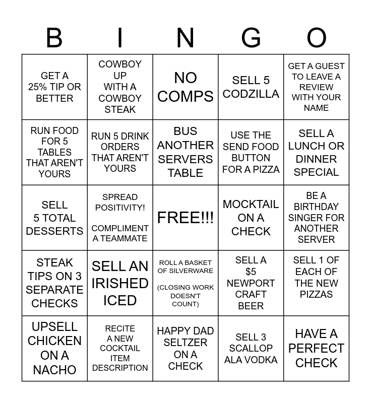 This bingo card has a free space and 24 words: SELL AN IRISHED ICED, RECITE A NEW COCKTAIL ITEM DESCRIPTION, BUS ANOTHER SERVERS TABLE, UPSELL CHICKEN ON A NACHO, GET A GUEST TO LEAVE A REVIEW WITH YOUR NAME, GET A 25% TIP OR BETTER, RUN FOOD FOR 5 TABLES THAT AREN'T YOURS, COWBOY UP WITH A COWBOY STEAK, MOCKTAIL ON A CHECK, ROLL A BASKET OF SILVERWARE (CLOSING WORK DOESN'T COUNT), USE THE SEND FOOD BUTTON FOR A PIZZA, SELL 5 TOTAL DESSERTS, SELL A $5 NEWPORT CRAFT BEER, SELL 1 OF EACH OF THE NEW PIZZAS, RUN 5 DRINK ORDERS THAT AREN'T YOURS, SELL 3 SCALLOP ALA VODKA, BE A BIRTHDAY SINGER FOR ANOTHER SERVER, NO COMPS, SELL A LUNCH OR DINNER SPECIAL, SPREAD POSITIVITY! COMPLIMENT A TEAMMATE, HAVE A PERFECT CHECK, STEAK TIPS ON 3 SEPARATE CHECKS, SELL 5 CODZILLA and HAPPY DAD SELTZER ON A CHECK.