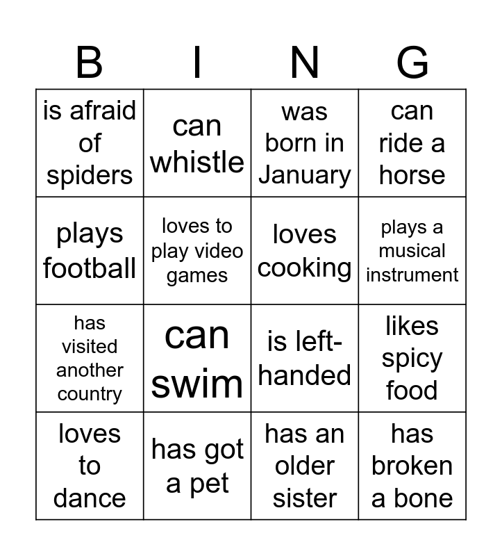 This bingo card has 16 words: has got a pet, likes spicy food, was born in January, is afraid of spiders, has visited another country, can whistle, is left-handed, has an older sister, plays football, loves to play video games, loves to dance, can ride a horse, can swim, plays a musical instrument, loves cooking and has broken a bone.