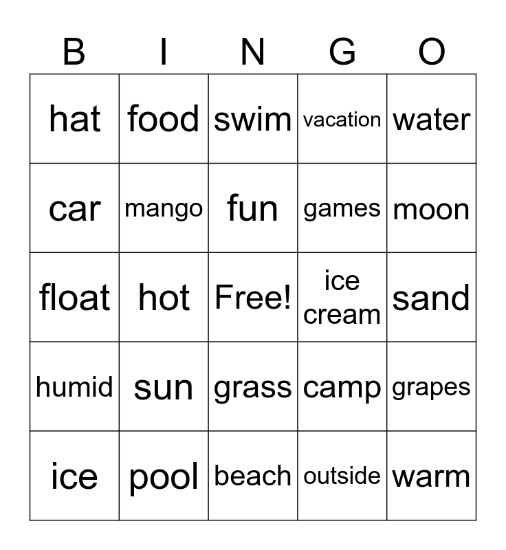 This bingo card has a free space and 24 words: sun, pool, fun, ice, water, hat, car, food, ice cream, grass, games, float, camp, grapes, mango, outside, sand, swim, moon, hot, warm, humid, vacation and beach.