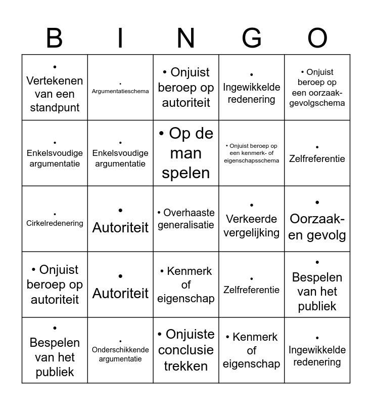 This bingo card has 55 words: • Oorzaak- en gevolg, • Bespelen van het publiek, • Nevenschikkende argumentatie, • Vertekenen van een standpunt, • Onjuiste conclusie trekken, • Causaliteit, • Enkelsvoudige argumentatie, • Cirkelredenering, • Onjuist beroep op een kenmerk- of eigenschapsschema, • Onjuist beroep op autoriteit, • Ingewikkelde redenering, • Overdrijven van voor- of nadelen, Free!, • Argumentatieschema, • BONUS!, • Algemene uitspraken en voorbeelden, • Onjuist beroep op een oorzaak-gevolgschema, • Autoriteit, • Onderschikkende argumentatie, • Overhaaste generalisatie, • Verkeerde vergelijking, • Vals dilemma, • Zelfreferentie, • Onjuist beroep op autoriteit, • BONUS!, • Op de man spelen, • Kenmerk of eigenschap, • Inconsistentie, • Oorzaak- en gevolg, • Bespelen van het publiek, • Nevenschikkende argumentatie, • Vertekenen van een standpunt, • Onjuiste conclusie trekken, • Causaliteit, • Enkelsvoudige argumentatie, • Cirkelredenering, • Onjuist beroep op een kenmerk- of eigenschapsschema, • Onjuist beroep op autoriteit, • Ingewikkelde redenering, • Overdrijven van voor- of nadelen, • Argumentatieschema, • Free!, • Algemene uitspraken en voorbeelden, • Onjuist beroep op een oorzaak-gevolgschema, • Autoriteit, • Onderschikkende argumentatie, • Overhaaste generalisatie, • Verkeerde vergelijking, • Vals dilemma, • Zelfreferentie, • Onjuist beroep op autoriteit, • Free!, • Op de man spelen, • Kenmerk of eigenschap and • Inconsistentie.