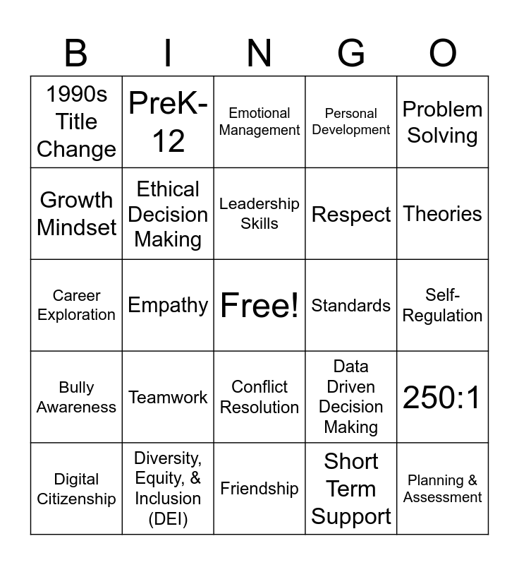 This bingo card has a free space and 61 words: Academic Goals, Diversity, Equity, & Inclusion (DEI), Community Resources, Bully Awareness, Short Term Support, Systemic Change, Ethical Decision Making, Restorative Practices, Respect, Goal Setting, Personal Development, Small Group, Growth Mindset, Second Step, ASCA National Model, 1990s Title Change, Planning & Assessment, Problem Solving, Consultation, Leadership Skills, Standards, Emotional Management, Digital Citizenship, 250:1, Respect, 80%, ASCA Ethical & Professional Standards, 988, Theories, Comprehensive School Counseling Program, Lunch Bunch, Student Success, Master's Degree in School Counseling, Confidentiality, PreK-12, School Climate, Student Advocacy, Empathy, Coping Strategies, Career Exploration, Kindness, Teamwork, Self-Regulation, Responsibility, Data Driven Decision Making, Social Emotional Learning, Upstander, ASCA (American School Counselor Association), Mindfulness, Conflict Resolution, Friendship, Social Skills, Collaboration, Classroom Lessons, Stakeholders, Referrals, Healthy Relationships, KSCA (Kansas School Counselor Association), SAEBRS & mySAEBRS, Mental Health and 1:1 Counseling Support.