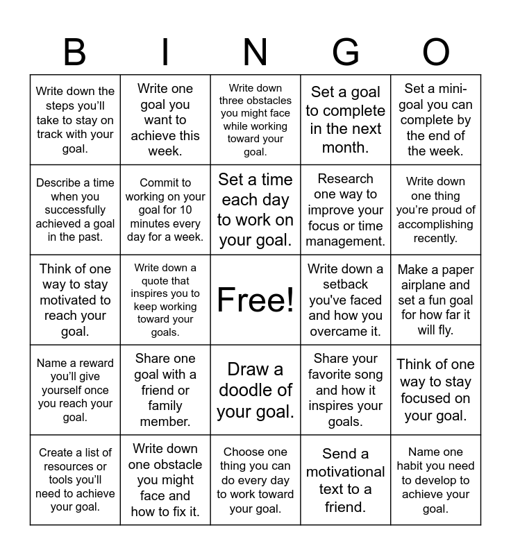 This bingo card has a free space and 85 words: Write down a short-term goal you want to achieve this month., Create a timeline for achieving one of your goals., Write down three obstacles you might face while working toward your goal., List one person who can support you in achieving your goal., Set a specific time each day to work toward a goal., Describe one way you can stay motivated to reach a goal., Identify one skill you need to improve to achieve your goal., Break down a large goal into smaller, manageable steps., Write down one thing you could do today to move closer to your goal., Share a goal with a friend and ask them to check in on your progress., Write a positive affirmation to motivate you while working toward your goal., Create a vision board or draw something that represents your goal., Commit to working on your goal for 10 minutes every day for a week., Write down a setback you've faced and how you overcame it., Describe a reward you’ll give yourself once you achieve your goal., Write down the steps you’ll take to stay on track with your goal., Create a list of resources or tools you’ll need to achieve your goal., Describe a time when you successfully achieved a goal in the past., Write down how you’ll celebrate when you achieve your goal., Set a long-term goal you want to achieve in the next year., Write a plan for how to track your progress toward your goal., Research one way to improve your focus or time management., Name one habit you need to develop to achieve your goal., Set a mini-goal that you can achieve within the next week., Write down a quote that inspires you to keep working toward your goals., Write one goal you want to achieve this week., Set a time each day to work on your goal., Name one person who can help you with your goal., Write one small step you can take today to reach your goal., Draw a picture that represents your goal., Share one goal with a friend or family member., Write down one obstacle you might face and how to fix it., Set a goal to complete in the next month., Think of one way to stay motivated to reach your goal., Write down something positive you can tell yourself when working on a goal., Break a big goal into two smaller steps., Choose one thing you can do every day to work toward your goal., Write down one thing you will do tomorrow to help you reach your goal., Name a reward you’ll give yourself once you reach your goal., Write down one thing you’re proud of accomplishing recently., Set a mini-goal you can complete by the end of the week., Write down a goal you’ve already achieved., Think of one way to stay focused on your goal., List a skill you need to improve to reach your goal., Write down how you’ll track your progress., Choose a habit you want to work on., Set a goal for something you want to improve in school., Write a short note about how your goal will help you., Name one thing you can do today to make progress on your goal., Write a goal for something fun you want to do., Write one goal you want to achieve this week., Set a time each day to work on your goal., Name one person who can help you with your goal., Write one small step you can take today to reach your goal., Draw a picture that represents your goal., Share one goal with a friend or family member., Write down one obstacle you might face and how to fix it., Set a goal to complete in the next month., Think of one way to stay motivated to reach your goal., Write down something positive you can tell yourself when working on a goal., Break a big goal into two smaller steps., Choose one thing you can do every day to work toward your goal., Write down one thing you will do tomorrow to help you reach your goal., Name a reward you’ll give yourself once you reach your goal., Write down one thing you’re proud of accomplishing recently., Set a mini-goal you can complete by the end of the week., Write down a goal you’ve already achieved., Think of one way to stay focused on your goal., List a skill you need to improve to reach your goal., Write down how you’ll track your progress., Choose a habit you want to work on., Set a goal for something you want to improve in school., Write a short note about how your goal will help you., Name one thing you can do today to make progress on your goal., Do a silly dance or something fun for 30 seconds to celebrate your goal!, Draw a doodle of your goal., Send a motivational text to a friend., Write down your favorite goal-setting quote., Take a break and watch a 1-minute funny video to recharge., Create a meme about your goal., Make a paper airplane and set a fun goal for how far it will fly., Do 5 jumping jacks and cheer for your goal!, Draw a cartoon of yourself achieving your goal., Share your favorite song and how it inspires your goals. and Take a funny selfie with your goal and share it with a friend..