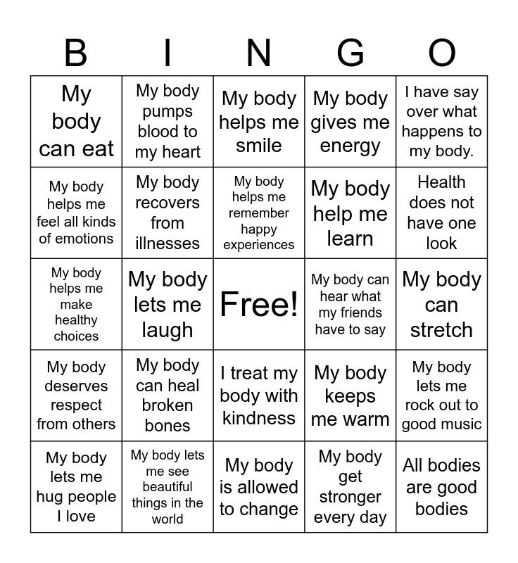 This bingo card has a free space and 29 words: My body lets me hug people I love, My body gets me from place to place, My body lets me laugh, My body lets me dance, My body can eat, My body helps me smile, My body recovers from illnesses, My body can heal broken bones, My body can hear what my friends have to say, My body lets me see beautiful things in the world, My body can stretch, All bodies are good bodies, My body is allowed to change, My body get stronger every day, Health does not have one look, My body is worthy of love, I treat my body with kindness, My body deserves respect from others, I have say over what happens to my body., My body helps me make healthy choices, My body keeps me warm, My body can cool me down, My body help me learn, My body helps me feel all kinds of emotions, My body gives me energy, My body pumps blood to my heart, My body lets me rock out to good music, My body helps me remember happy experiences and My body has the ability to sleep when I need rest!.