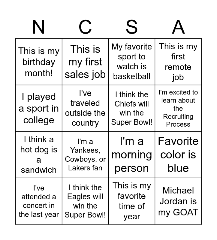 This bingo card has 16 words: I think the Eagles will win the Super Bowl!, Favorite color is blue, My favorite sport to watch is basketball, This is my birthday month!, I think a hot dog is a sandwich, This is my first sales job, I'm a morning person, This is my favorite time of year, I played a sport in college, I've traveled outside the country, I've attended a concert in the last year, This is my first remote job, I'm a Yankees, Cowboys, or Lakers fan, I'm excited to learn about the Recruiting Process, I think the Chiefs will win the Super Bowl! and Michael Jordan is my GOAT.