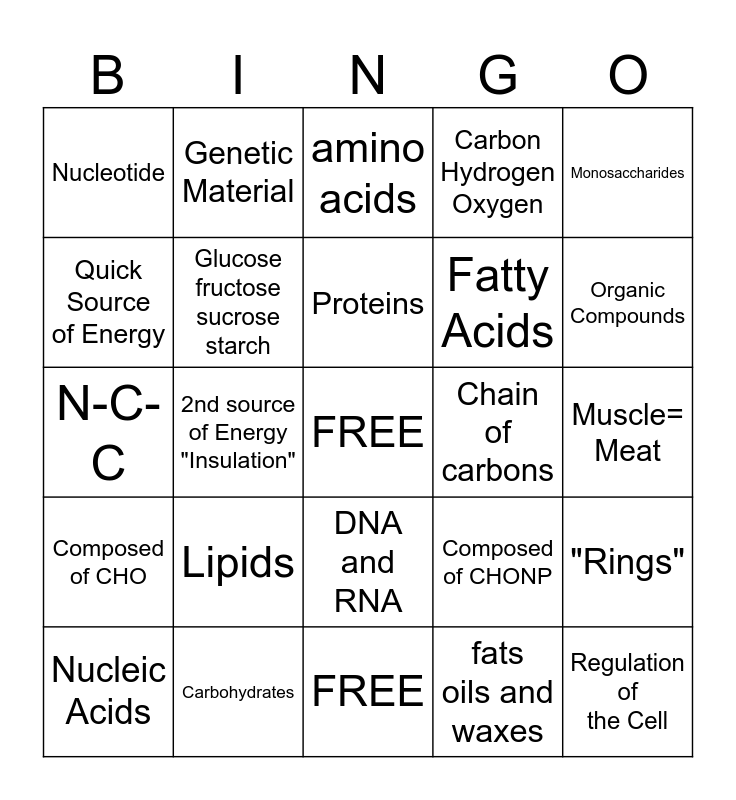 This bingo card has a free space and 24 words: Lipids, Carbohydrates, Proteins, Nucleic Acids, Monosaccharides, Nucleotide, Quick Source of Energy, Genetic Material, Chain of carbons, DNA and RNA, Fatty Acids, N-C-C, Composed of CHONP, "Rings", Glucose fructose sucrose starch, fats oils and waxes, Muscle= Meat, amino acids, Organic Compounds, 2nd source of Energy "Insulation", Regulation of the Cell, Composed of CHO, Carbon Hydrogen Oxygen and FREE.