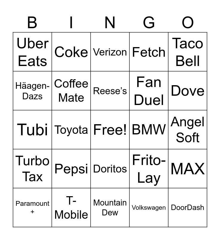 This bingo card has a free space and 35 words: Tostinos Pizza Rolls, Square Space, MSC Cruises, Coffee Mate, Doritos, Fetch, Häagen-Dazs, Instacart, Reese’s, Rocket, Tubi, Taco Bell, Pringles, Helmans, Uber Eats, BMW, Volkswagen, Toyota, Turbo Tax, DoorDash, Frito-Lay, Paramount +, MAX, T-Mobile, Verizon, Dove, Google, HexClad, Fan Duel, Angel Soft, Booking.com, Mountain Dew, Pepsi, Coke and Nerds.