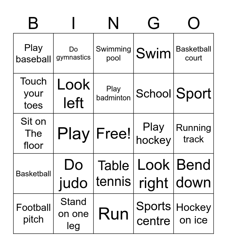 This bingo card has a free space and 24 words: Football pitch, Do judo, Play badminton, Sports centre, Basketball court, Play baseball, Do gymnastics, Swimming pool, Play hockey, Running track, Sit on The floor, Look left, Look right, Bend down, Touch your toes, Stand on one leg, Run, Swim, Sport, Basketball, Play, Table tennis, School and Hockey on ice.