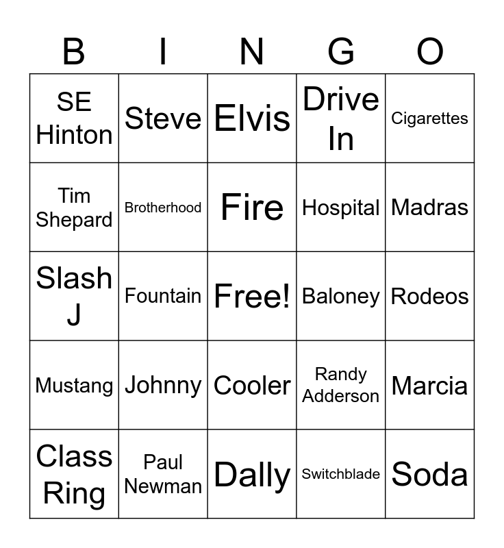 This bingo card has a free space and 49 words: Ponyboy, Soda, Darry, Dally, Johnny, Two Bit, Steve, Bob Sheldon, Tim Shepard, Brumly Boys, Brotherhood, Drive In, Marcia, Randy Adderson, Cherry, Church, Fire, Baloney, Chocolate Cake, Cigarettes, Fountain, Switchblade, SE Hinton, Hospital, Tuff, Madras, Class Ring, Rumble, Cooler, Mustang, Beach Movies, Corvair, Gone with the Wind, Hank Williams, Paul Newman, Perry Mason, Barrel Race, Bull-Riding, Rodeos, Dairy Queen, Greaser, Soc, Sunset, Jay Mountain, Slash J, Elvis, Mickey Mouse, Violence and Loss.