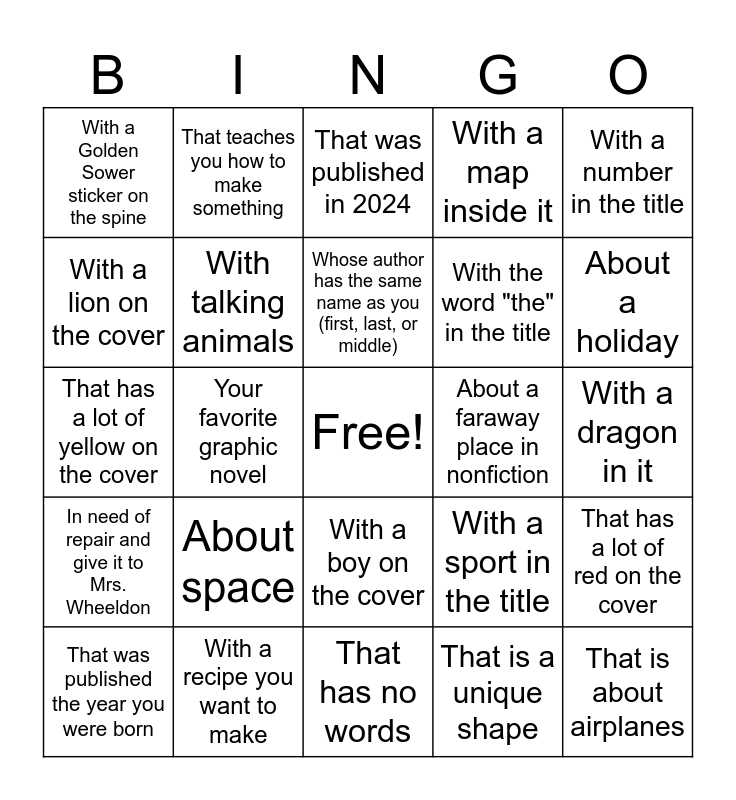 This bingo card has a free space and 28 words: That has a lot of red on the cover, With one word in the title, With the word "the" in the title, That is a unique shape, With a lion on the cover, That was published in 2024, That teaches you how to make something, In need of repair and give it to Mrs. Wheeldon, About a faraway place in nonfiction, That was published the year you were born, That has a lot of yellow on the cover, With a map inside it, With a recipe you want to make, That has no words, About a holiday, About how something works, About space, With talking animals, Whose author has the same name as you (first, last, or middle), With a boy on the cover, With a Golden Sower sticker on the spine, With a different language on it somewhere, That is about airplanes, Your favorite graphic novel, With a dragon in it, With a sport in the title, With a number in the title and With a girl on the cover.