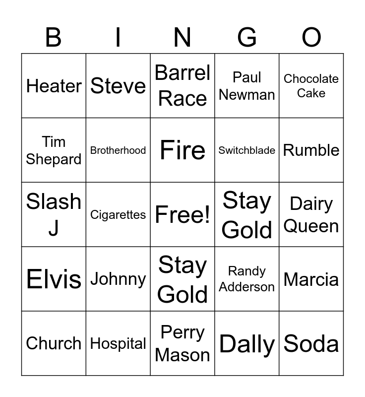 This bingo card has a free space and 53 words: Ponyboy, Soda, Darry, Dally, Johnny, Two Bit, Steve, Bob Sheldon, Tim Shepard, Brumly Boys, Brotherhood, Drive In, Marcia, Randy Adderson, Cherry, Church, Fire, Stay Gold, Baloney, Chocolate Cake, Cigarettes, Fountain, Switchblade, Heater, SE Hinton, Hospital, Tuff, Madras, Class Ring, Rumble, Cooler, Mustang, Beach Movies, Corvair, Gone with the Wind, Hank Williams, Paul Newman, Perry Mason, Barrel Race, Saddle-Bronc, Bull-Riding, Rodeos, Dairy Queen, Greaser, Soc, Stay Gold, Sunset, Jay Mountain, Slash J, Elvis, Mickey Mouse, Violence and Loss.