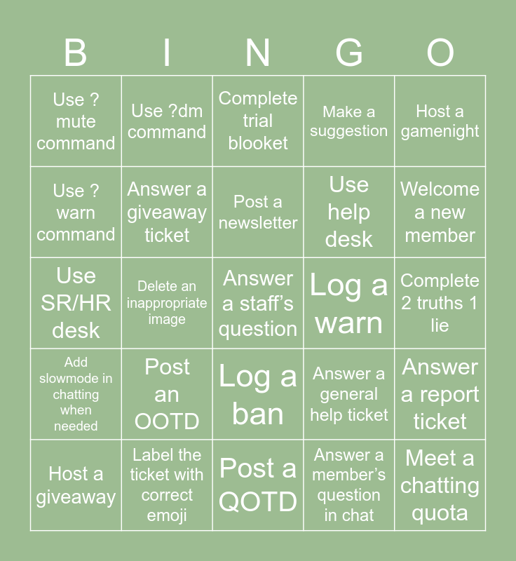 This bingo card has 25 words: Post an OOTD, Post a QOTD, Post a newsletter, Host a giveaway, Host a gamenight, Use ?mute command, Use ?warn command, Use ?dm command, Log a warn, Log a ban, Use help desk, Use SR/HR desk, Answer a general help ticket, Answer a report ticket, Answer a giveaway ticket, Meet a chatting quota, Complete 2 truths 1 lie, Complete trial blooket, Welcome a new member, Delete an inappropriate image, Answer a staff’s question, Label the ticket with correct emoji, Add slowmode in chatting when needed, Make a suggestion and Answer a member’s question in chat.