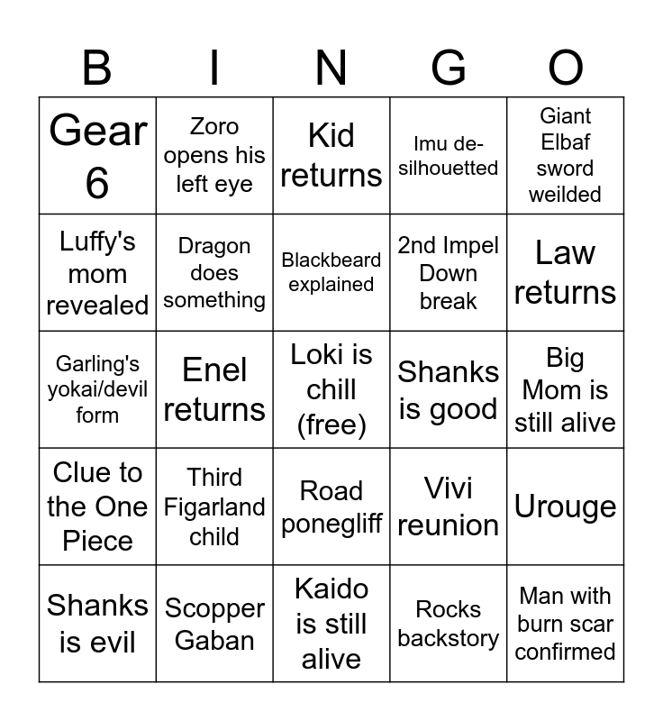 This bingo card has a free space and 24 words: Third Figarland child, Scopper Gaban, Blackbeard explained, Shanks is evil, Giant Elbaf sword weilded, Gear 6, Luffy's mom revealed, Zoro opens his left eye, Shanks is good, Road ponegliff, 2nd Impel Down break, Garling's yokai/devil form, Vivi reunion, Urouge, Dragon does something, Rocks backstory, Big Mom is still alive, Kid returns, Law returns, Enel returns, Man with burn scar confirmed, Clue to the One Piece, Imu de-silhouetted and Kaido is still alive.