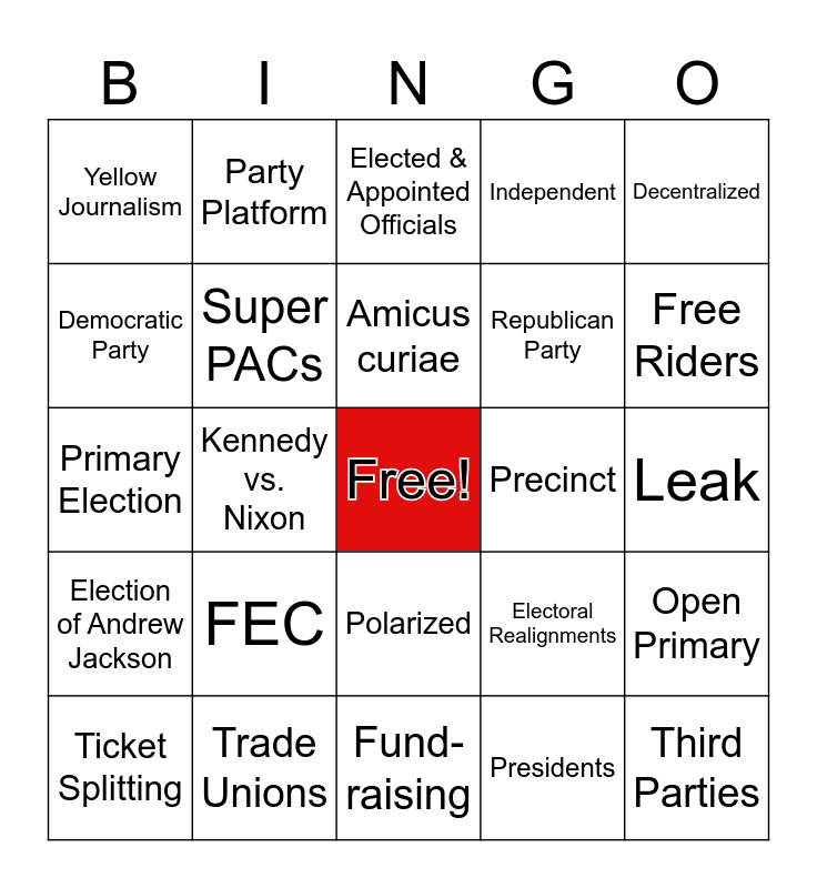 This bingo card has a free space and 27 words: Electoral Realignments, Party Machines & Patronage, Republican Party, Fund-raising, Democratic Party, Elected & Appointed Officials, Party Platform, Election of Andrew Jackson, Precinct, Open Primary, Primary Election, Independent, Ticket Splitting, Trade Unions, Free Riders, PACs, Super PACs, Amicus curiae, FEC, Yellow Journalism, Leak, Presidents, Kennedy vs. Nixon, Third Parties, Polarized, Decentralized and Multi-party system.
