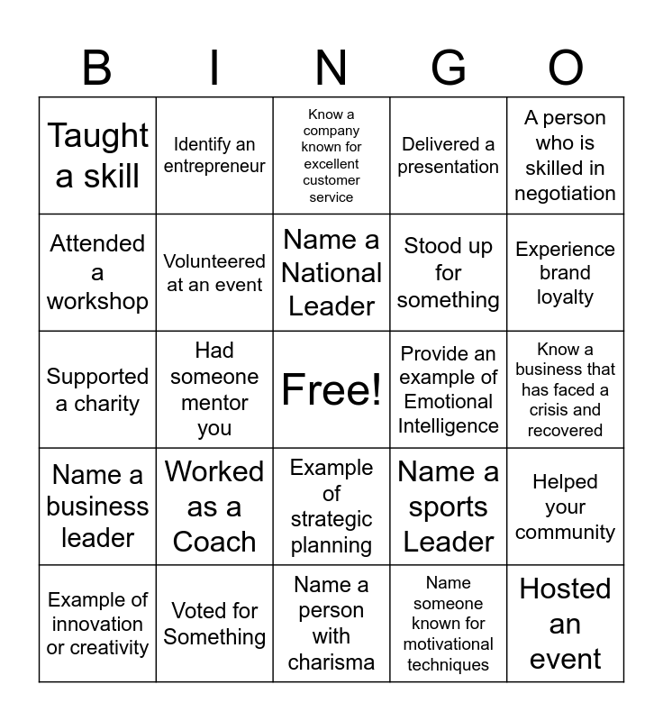 This bingo card has a free space and 24 words: Worked as a Coach, Voted for Something, Name a National Leader, Example of innovation or creativity, A person who is skilled in negotiation, Taught a skill, Attended a workshop, Identify an entrepreneur, Provide an example of Emotional Intelligence, Example of strategic planning, Stood up for something, Supported a charity, Name a sports Leader, Helped your community, Volunteered at an event, Name someone known for motivational techniques, Know a business that has faced a crisis and recovered, Know a company known for excellent customer service, Experience brand loyalty, Had someone mentor you, Hosted an event, Name a business leader, Delivered a presentation and Name a person with charisma.