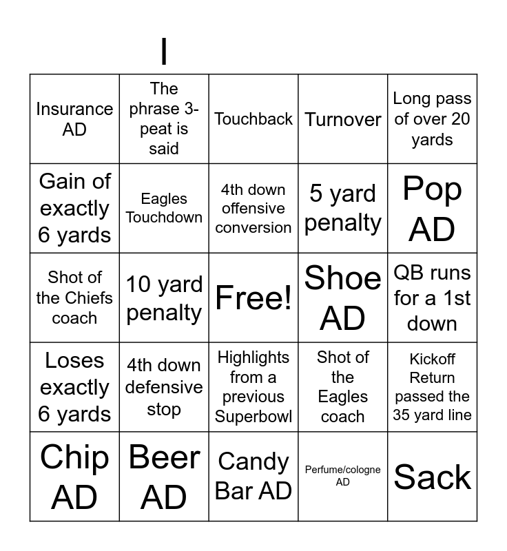This bingo card has a free space and 38 words: Chiefs Field Goal, Eagles Field Goal, Chiefs Touchdown, Eagles Touchdown, Kickoff Return passed the 35 yard line, 4th down defensive stop, 4th down offensive conversion, Long run of over 10 yards, Long pass of over 20 yards, 5 yard penalty, 10 yard penalty, Turnover, Sack, QB runs for a 1st down, Gain of exactly 6 yards, Loses exactly 6 yards, Missed Field\ Extra Point, Touchback, Cellphone AD, Shoe AD, Insurance AD, Beer AD, Pop AD, Chip AD, Car AD, Candy Bar AD, Longer than 30 sec AD, AD with a monkey, Fast Food AD, Shot of a Celebrity, Gambling AD, Highlights from a previous Superbowl, Perfume/cologne AD, The phrase 3-peat is said, Timeout is taken, Shot of the Eagles coach, Shot of the Chiefs coach and The phrase Redzone is said.