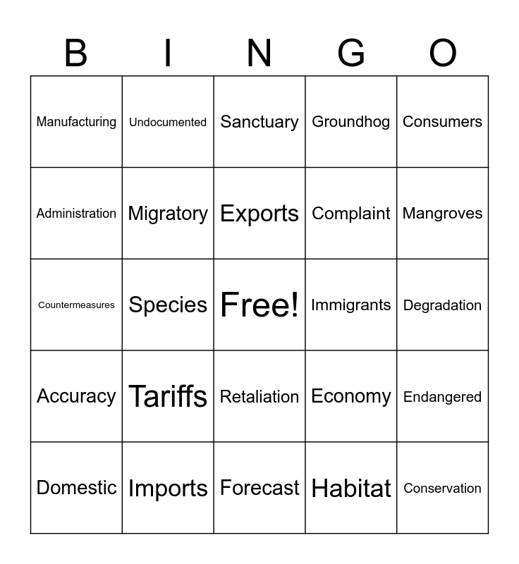 This bingo card has a free space and 24 words: Tariffs, Imports, Exports, Domestic, Consumers, Manufacturing, Administration, Undocumented, Immigrants, Retaliation, Complaint, Countermeasures, Economy, Endangered, Migratory, Habitat, Degradation, Sanctuary, Mangroves, Species, Conservation, Accuracy, Groundhog and Forecast.