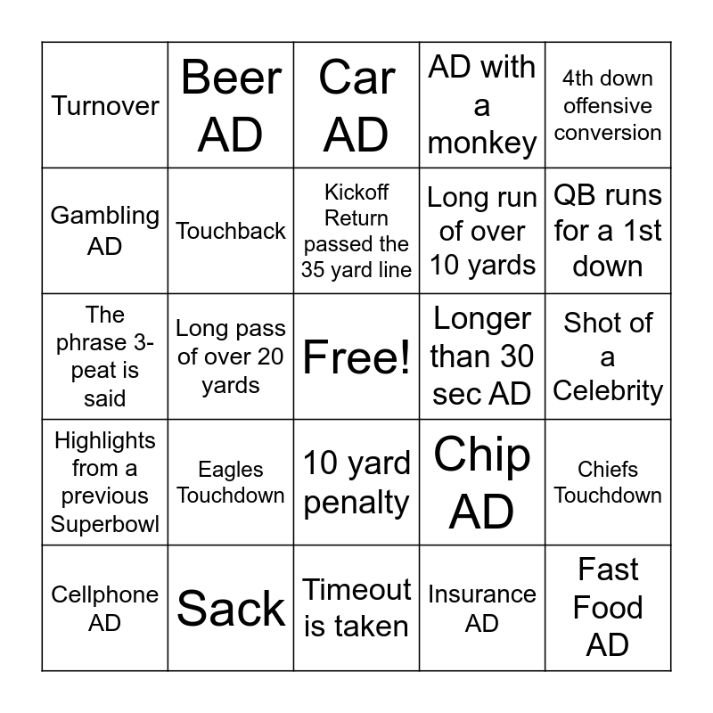 This bingo card has a free space and 38 words: Gain of exactly 6 yards, Loses exactly 6 yards, Missed Field\ Extra Point, Touchback, Chiefs Touchdown, Eagles Touchdown, Kickoff Return passed the 35 yard line, 4th down defensive stop, 4th down offensive conversion, Long run of over 10 yards, Long pass of over 20 yards, AD with a monkey, Fast Food AD, Shot of a Celebrity, Gambling AD, Highlights from a previous Superbowl, Perfume/cologne AD, Car AD, Candy Bar AD, Longer than 30 sec AD, Turnover, Sack, QB runs for a 1st down, Cellphone AD, Shoe AD, Timeout is taken, Shot of the Eagles coach, Shot of the Chiefs coach, Chiefs Field Goal, Eagles Field Goal, 5 yard penalty, 10 yard penalty, Insurance AD, Beer AD, Pop AD, Chip AD, The phrase 3-peat is said and The phrase Redzone is said.