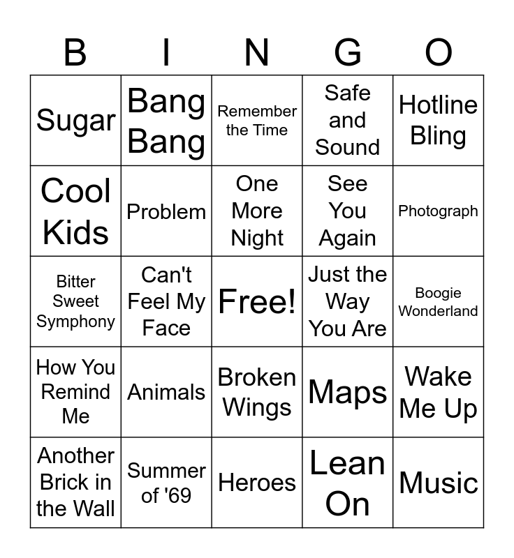 This bingo card has a free space and 50 words: It's My Life, Music, Latch, Heroes, Animals, Rather Be, Bang Bang, Boom Clap, Cool Kids, Break Free, Problem, Safe and Sound, Wake Me Up, Maps, Demons, Chandelier, One More Night, Just the Way You Are, Blurred Lines, Hotline Bling, Can't Feel My Face, Lean On, Sugar, See You Again, Locked Away, Worth It, Photograph, Whenever, Wherever, Remember the Time, Broken Wings, Self Esteem, Down Under, Uprising, Hold the Line, Summer of '69, Time After Time, Africa, Clocks, I'm So Excited, Boogie Wonderland, Give Me All Your Lovin', Don't You (Forget About Me), Roxanne, Every Breath You Take, Another Brick in the Wall, Bitter Sweet Symphony, We Will Rock You, Just a Girl, How You Remind Me and Paint It Black.