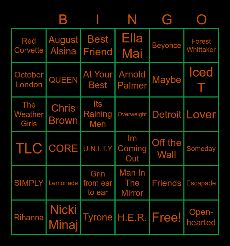 This bingo card has 42 words: Free!, QUEEN, SHE, Detroit, Someday, CORE, The Weather Girls, YOLO, Best Friend, Lover, Its Raining Men, Arnold Palmer, Iced T, Beyonce, Nicki Minaj, TLC, Escapade, Maybe, Open-hearted, August Alsina, Forest Whittaker, Grin from ear to ear, SIMPLY, Red Corvette, A Smile, Rihanna, At Your Best, New York, Lemonade, Friends, One Sweet Day, Overweight, October London, Off the Wall, Tyrone, U.N.I.T.Y, Im Coming Out, Chris Brown, Man In The Mirror, H.E.R., Ella Mai and TUPAC.