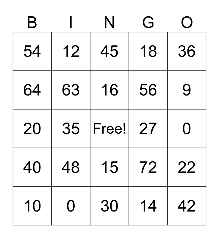 This bingo card has a free space and 24 words: 10, 48, 16, 14, 36, 54, 12, 45, 27, 0, 20, 63, 72, 22, 64, 0, 30, 18, 9, 40, 35, 15, 56 and 42.