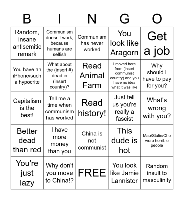 This bingo card has 25 words: Better dead than red, Why don't you move to China!?, Read history!, You look like Jamie Lannister, Get a job, Random, insane antisemitic remark, Communism doesn't work, because humans are selfish, Communism has never worked, Just tell us you're really a fascist, Mao/Stalin/Che were horrible people, You have an iPhone/such a hypocrite, What about the (insert #) dead in (insert country)?, FREE, This dude is hot, Why should I have to pay for you?, You're just lazy, Tell me a time when communism has worked, Read Animal Farm, I moved here from (insert communist country) and you have no idea what it was like, What's wrong with you?, Capitalism is the best!, I have more money than you, China is not communist, You look like Aragorn and Random insult to masculinity.