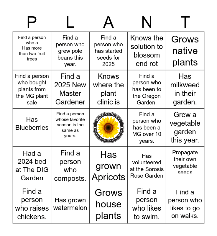 This bingo card has a free space and 25 words: Find a person who composts., Grows house plants, Knows where the plant clinic is, Find a person who raises chickens., Grows native plants, Find a person who a Has more than two fruit trees, Find a person who bought plants from the MG plant sale, Find a person who grew pole beans this year., Find a person who has been a MG over 10 years., Has grown Apricots, Find a person who has been to the Oregon Garden., Has Blueberries, Has volunteered at the Sorosis Rose Garden, Propagate their own vegetable seeds, Find a 2025 New Master Gardener, Find a person who is a “night owl”., Grew a vegetable garden this year., Find a person who has started seeds for 2025, Has milkweed in their garden., Find a person whose favorite season is the same as yours., Find a person who likes to go on walks., Has grown watermelon, Had a 2024 bed at The DIG Garden, Knows the solution to blossom end rot and Find a person who likes to swim..