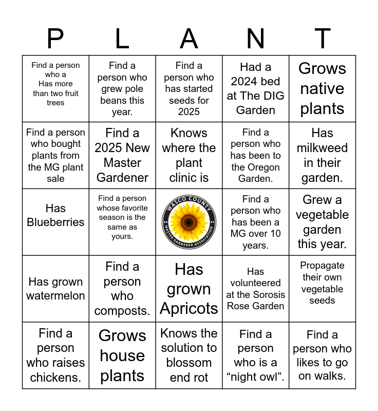 This bingo card has a free space and 24 words: Find a person who composts., Grows house plants, Knows where the plant clinic is, Find a person who raises chickens., Grows native plants, Find a person who a Has more than two fruit trees, Find a person who bought plants from the MG plant sale, Find a person who grew pole beans this year., Find a person who has been a MG over 10 years., Has grown Apricots, Find a person who has been to the Oregon Garden., Has Blueberries, Has volunteered at the Sorosis Rose Garden, Propagate their own vegetable seeds, Find a 2025 New Master Gardener, Find a person who is a “night owl”., Grew a vegetable garden this year., Find a person who has started seeds for 2025, Has milkweed in their garden., Find a person whose favorite season is the same as yours., Find a person who likes to go on walks., Has grown watermelon, Had a 2024 bed at The DIG Garden and Knows the solution to blossom end rot.