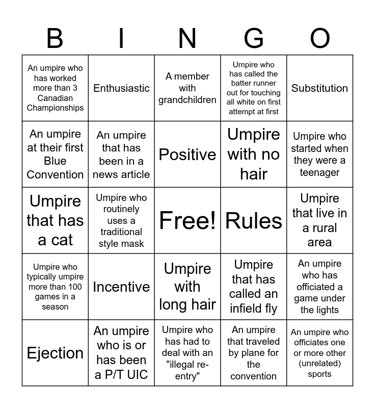 This bingo card has a free space and 24 words: Incentive, An umpire who is or has been a P/T UIC, Positive, Ejection, Substitution, An umpire who has worked more than 3 Canadian Championships, An umpire at their first Blue Convention, Enthusiastic, Rules, Umpire with long hair, Umpire with no hair, Umpire that has a cat, Umpire that has called an infield fly, An umpire who has officiated a game under the lights, An umpire that has been in a news article, An umpire that traveled by plane for the convention, Umpire that live in a rural area, A member with grandchildren, Umpire who started when they were a teenager, Umpire who routinely uses a traditional style mask, An umpire who officiates one or more other (unrelated) sports, Umpire who typically umpire more than 100 games in a season, Umpire who has called the batter runner out for touching all white on first attempt at first and Umpire who has had to deal with an "illegal re-entry".