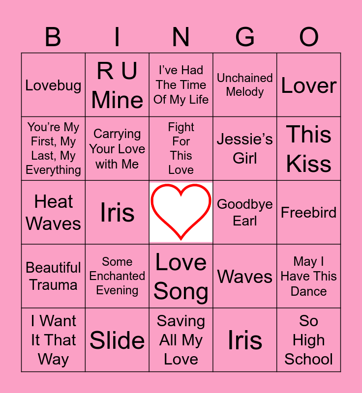 This bingo card has a free space and 250 words: Jolene, Love Spell, Baby, I Wanna Dance with Somebody, Hey There Delilah, Neon Moon, You Belong With Me, Can’t Buy Me Love, Such Great Heights, Banana Pancakes, Better Together, Check Yes or No, Meet in the Middle, Love Story, I Will Always Love You, You Save Me, This Kiss, So High School, The Alchemy, Lover, Baby I’m Yours, Sara Smile, 26, Bad Haircuts, Waves, If Good Times Were Dollars, Love Song, Carrying Your Love With Me, All Mine, Slide, Always Lovin’ You, Love Will Keep Us Alive, I Miss You, Iris, Afternoon Delight, I Want It That Way, Love in the Elevator, Kiss By A Rose, I’ll Make Love To You, It Wasn’t Me, All My Life, Let’s Get it On, Can’t Fight This Feeling, Open Arms, The Rose, Saving All My Love, Jessie’s Girl, Easy, Pick up the Change, I’m Always in Love, I’m Trying to Break Your Heart, Let’s Get it On reprise, Lately baby- Al Green, Fight For This Love, Espresso, Short n Sweet, Before You Cheat, Revenge, Look What You Made Me Do, Let Me Come Home, Goodbye Carl, Kissing in the River, Do You Realize, A Lesson in Leaving, Breathless, Toxic, Beautiful Trauma, Can’t Help Falling in Love, What’s Love Got to Do With It, What is Love?, Endless Love, Paradise by the Dashboard Light, Unchained Melody, I Love You Truly, Heartbreak Hotel, I Can’t Help Falling in Love with You, May I Have This Dance, L.O.V.E, Unforgettable, One Less Lonely Girl, Mistletoe, Lover, Stand By Me, Never Gonna Give You Up, An Old Fashioned Love Song, Love by the Dashboard Light, Amazing Grace, Just As I Am, O Mistress Mine, Love’s Philosophy, Love Grows (Where My Rosemary Goes), I Love Rock n Roll, She Loves Me, Lovely Day, Lean on Me, I Love You, I Honestly Love You, Your Song, All of Me, I Want It That Way, All You Need is Love, Love Me So, Some Enchanted Evening, At Last, Baby I’m Yours, R U Mine, This Kiss, So High School, Carrying Your Love with Me, Fire and Gasoline, Your Cheatin Heart, Achey Breaky Heart, Stairway to Heaven, Love Will Keep us Alive, I Love You Truly, Unchained Melody, Heartbreak Hotel, Book of Love, PS I Love You, Tunnel of Love, Won’t You Tell Me Your Name, May I Have This Dance, Pour Some Sugar on Me, All Out of Love, I Saw You First, Angie, Delilah, Everything, Just Haven’t Found You Yet, Cheery Soul, Gotta Go My Own Way, I’ve Had The Time Of My Life, I’m the Only One, Songbird, Freebird, Storybook Love, You're My First, My Last, My Everything, Conversations In the Dark, Jolene, Baby, I Wanna Dance with Somebody, Hey There Delilah, Neon Moon, You Belong With Me, Can’t Buy Me Love, Such Great Heights, Banana Pancakes, Better Together, Check Yes or No, Meet in the Middle, Love Story, I Will Always Love You, You Save Me, This Kiss, So High School, The Alchemy, Lover, Baby I’m Yours, Sara Smile, Heat Waves, Love Song, Carrying Your Love With Me, Slide, Love Will Keep Us Alive, I Miss You, Iris, Afternoon Delight, I Want It That Way, Love in the Elevator, Kiss By A Rose, I’ll Make Love To You, It Wasn’t Me, All My Life, Let’s Get it On, Can’t Fight This Feeling, Open Arms, Saving All My Love, Jessie’s Girl, Easy, Espresso, Before He Cheat, Look What You Made Me Do, Home, Goodbye Earl, Do You Realize, A Lesson in Leaving, Toxic, Beautiful Trauma, Can’t Help Falling in Love, What’s Love Got to Do With It, What is Love?, Endless Love, Paradise by the Dashboard Light, Unchained Melody, Heartbreak Hotel, I Can’t Help Falling in Love with You, May I Have This Dance, L.O.V.E, Unforgettable, One Less Lonely Girl, Mistletoe, Stand By Me, Never Gonna Give You Up, Amazing Grace, Just As I Am, Love Grows (Where My Rosemary Goes), I Love Rock n Roll, Lovely Day, Lean on Me, Your Song, All of Me, All You Need is Love, Some Enchanted Evening, At Last, R U Mine, Fire and Gasoline, Your Cheatin Heart, Achey Breaky Heart, Stairway to Heaven, Love Will Keep us Alive, Unchained Melody, Heartbreak Hotel, Tunnel of Love, Won’t You Tell Me Your Name, May I Have This Dance, All Out of Love, I LovedYou First, Just Haven’t MEt You Yet, Go youre own way, I’ve Had The Time Of My Life, I’m the Only One, Freebird, You’re My First, My Last, My Everything, Conversations In the Dark, No else on on earth, Kiss me thru the phone, Lets stay together, Home, Wish you were here, Beautiful things, We belong together, Amber, Enchanted, Rescue me, Hooked on a feeling, Lovebug, Nothing compares 2 u, Careless Whisper, You give love a bad name, With or Without You and My heart will go on.