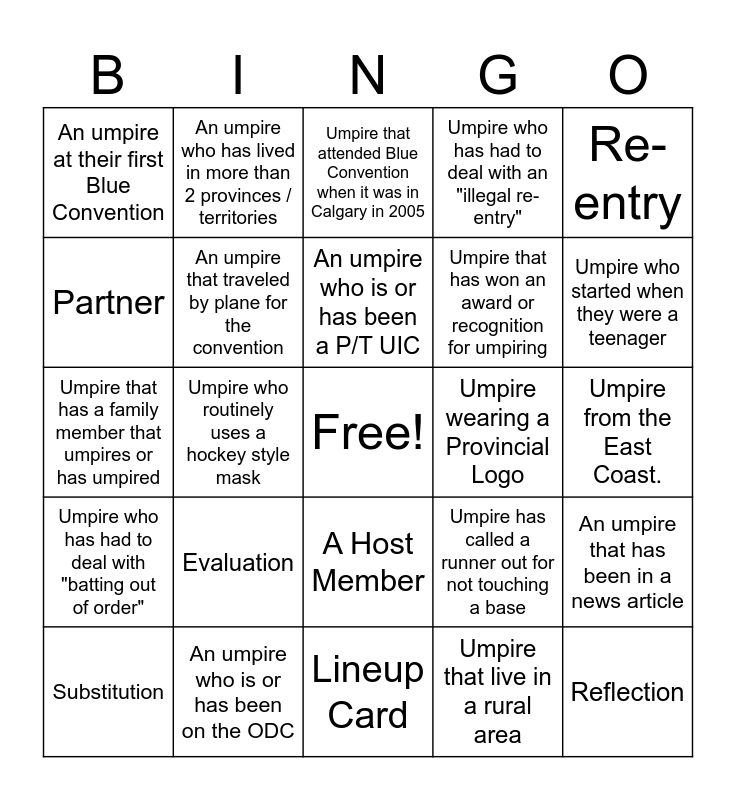 This bingo card has a free space and 24 words: Evaluation, An umpire who is or has been on the ODC, An umpire who is or has been a P/T UIC, Substitution, Re-entry, An umpire at their first Blue Convention, Partner, An umpire who has lived in more than 2 provinces / territories, Umpire wearing a Provincial Logo, A Host Member, Umpire that has won an award or recognition for umpiring, Umpire that has a family member that umpires or has umpired, Umpire has called a runner out for not touching a base, An umpire that has been in a news article, An umpire that traveled by plane for the convention, Umpire that live in a rural area, Umpire from the East Coast., Umpire that attended Blue Convention when it was in Calgary in 2005, Umpire who started when they were a teenager, Umpire who routinely uses a hockey style mask, Reflection, Umpire who has had to deal with "batting out of order", Umpire who has had to deal with an "illegal re-entry" and Lineup Card.