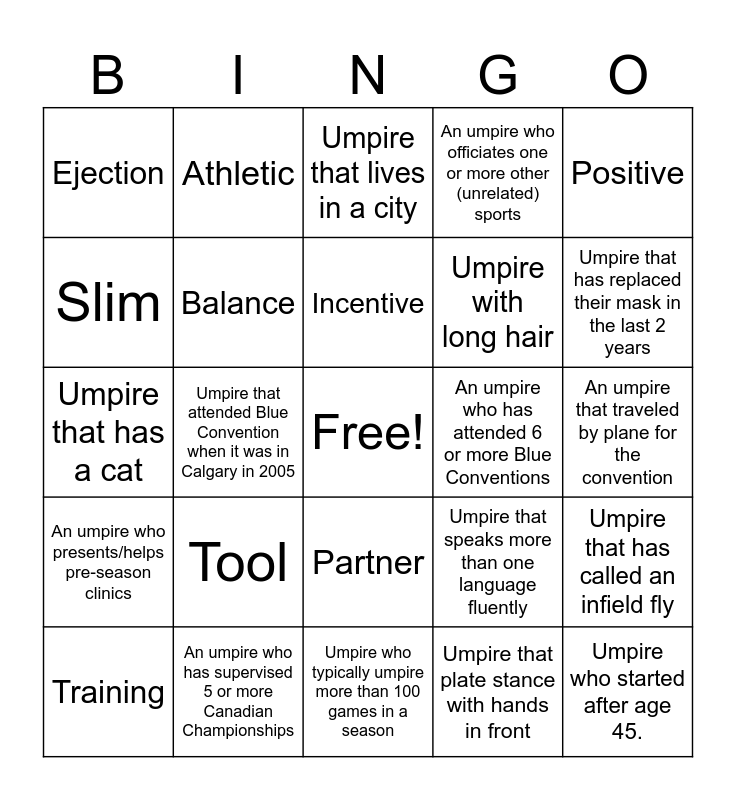 This bingo card has a free space and 24 words: Tool, An umpire who has supervised 5 or more Canadian Championships, Incentive, Training, Positive, Ejection, Slim, Athletic, An umpire who has attended 6 or more Blue Conventions, Partner, Umpire with long hair, Umpire that has a cat, Umpire that speaks more than one language fluently, Umpire that has called an infield fly, Balance, Umpire that plate stance with hands in front, An umpire that traveled by plane for the convention, Umpire that lives in a city, Umpire that has replaced their mask in the last 2 years, Umpire that attended Blue Convention when it was in Calgary in 2005, Umpire who started after age 45., An umpire who presents/helps pre-season clinics, An umpire who officiates one or more other (unrelated) sports and Umpire who typically umpire more than 100 games in a season.