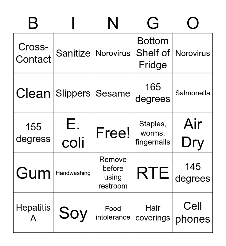 This bingo card has a free space and 24 words: Handwashing, Soy, Sesame, Hepatitis A, Norovirus, Cross-Contact, Clean, Sanitize, Staples, worms, fingernails, Remove before using restroom, 165 degrees, 155 degress, RTE, 145 degrees, Slippers, Hair coverings, Air Dry, Norovirus, Salmonella, E. coli, Cell phones, Gum, Bottom Shelf of Fridge and Food intolerance.