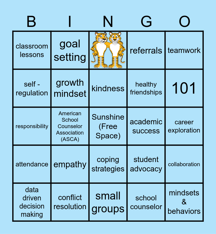 This bingo card has 1 images, a free space and 23 words: empathy, conflict resolution, kindness, data driven decision making, teamwork, classroom lessons, self - regulation, goal setting, academic success, coping strategies, healthy friendships, responsibility, student advocacy, collaboration, growth mindset, school counselor, career exploration, 101, American School Counselor Association (ASCA), mindsets & behaviors, attendance, referrals and small groups.