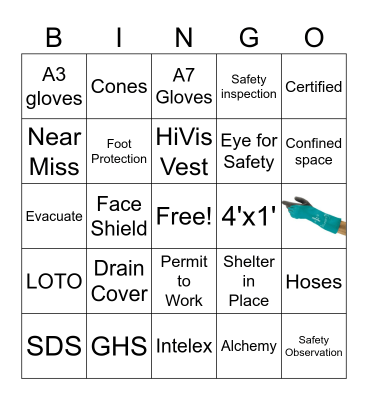 This bingo card has 1 images, a free space and 28 words: SDS, Goggles, Face Shield, Hand Protection, A3 gloves, A7 Gloves, Foot Protection, Drain Cover, 4'x1', GHS, Safety Observation, Intelex, Alchemy, Confined space, Work at Heights, Permit to Work, LOTO, Certified, Evacuate, Shelter in Place, Safety Committee, Eye for Safety, Near Miss, Safety inspection, Cones, Hoses, HiVis Vest and Bump Cap.