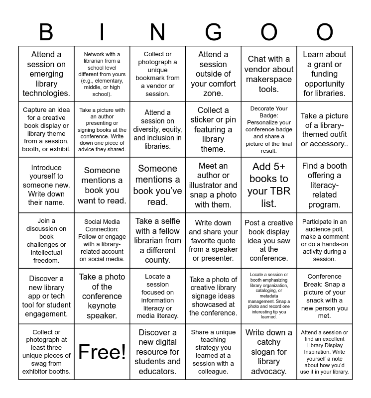 This bingo card has 39 words: Free!, Collect or photograph at least three unique pieces of swag from exhibitor booths., Create a "Bookface" photo where a book cover blends seamlessly with your body or surroundings., Capture an idea for a creative book display or library theme from a session, booth, or exhibit., Take a selfie with a fellow librarian from a different county., Find a booth offering a literacy-related program., Take a picture with an author presenting or signing books at the conference. Write down one piece of advice they shared., Attend a session or find an excellent Library Display Inspiration. Write yourself a note about how you’d use it in your library., Chat with a vendor about makerspace tools., Meet an author or illustrator and snap a photo with them., Take a picture of a library-themed outfit or accessory.., Attend a session outside of your comfort zone., Introduce yourself to someone new. Write down their name., Someone mentions a book you’ve read., Someone mentions a book you want to read., Add 5+ books to your TBR list., Locate a session or booth emphasizing library organization, cataloging, or metadata management. Snap a photo and record one interesting tip you learned., Attend a session on emerging library technologies., Discover a new digital resource for students and educators., Join a discussion on book challenges or intellectual freedom., Learn about a grant or funding opportunity for libraries., Post a creative book display idea you saw at the conference., Attend a session on diversity, equity, and inclusion in libraries., Collect a sticker or pin featuring a library theme., Share a unique teaching strategy you learned at a session with a colleague., Locate a session focused on information literacy or media literacy., Discover a new library app or tech tool for student engagement., Write down a catchy slogan for library advocacy., Take a photo of the conference keynote speaker., Network with a librarian from a school level different from yours (e.g., elementary, middle, or high school)., Find and scan a QR code at the conference and share what it leads to., Conference Break: Snap a picture of your snack with a new person you met., Collect or photograph a unique bookmark from a vendor or session., Write down and share your favorite quote from a speaker or presenter., Participate in an audience poll, make a comment or do a hands-on activity during a session., Take a photo of creative library signage ideas showcased at the conference., Social Media Connection: Follow or engage with a library-related account on social media., Decorate Your Badge: Personalize your conference badge and share a picture of the final result. and Share a Library Win: Talk to a fellow librarian and learn about a successful program or project they've implemented..