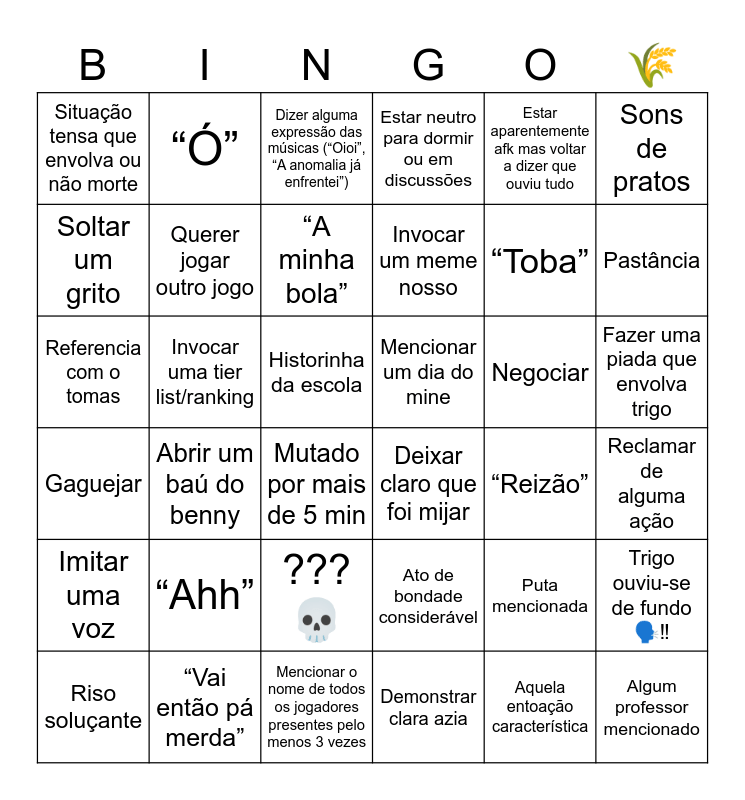 This bingo card has 36 words: Ato de bondade considerável, ??? 💀, Demonstrar clara azia, Soltar um grito, Gaguejar, Mencionar um dia do mine, Querer jogar outro jogo, Mencionar o nome de todos os jogadores presentes pelo menos 3 vezes, Estar aparentemente afk mas voltar a dizer que ouviu tudo, Puta mencionada, Pastância, Estar neutro para dormir ou em discussões, Trigo ouviu-se de fundo 🗣️‼️, Invocar uma tier list/ranking, Invocar um meme nosso, Situação tensa que envolva ou não morte, Imitar uma voz, Negociar, Referencia com o tomas, Dizer alguma expressão das músicas (“Oioi”, “A anomalia já enfrentei”), Historinha da escola, Abrir um baú do benny, Deixar claro que foi mijar, Mutado por mais de 5 min, “Reizão”, “Ó”, “Toba”, “Vai então pá merda”, “A minha bola”, Sons de pratos, Algum professor mencionado, Riso soluçante, Reclamar de alguma ação, Fazer uma piada que envolva trigo, “Ahh” and Aquela entoação característica.