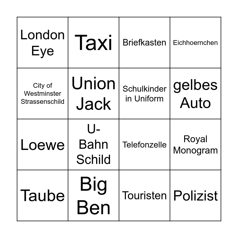 This bingo card has 21 words: Big Ben, roter Doppeldecker, Taxi, Kings Guard, Touristen, Schulkinder in Uniform, London Eye, Briefkasten, Telefonzelle, gelbes Auto, Loewe, Eichhoernchen, Polizist, Satue mit Pferd, Union Jack, Poppies, Taube, U-Bahn Schild, City of Westminster Strassenschild, Royal Monogram and Krone.