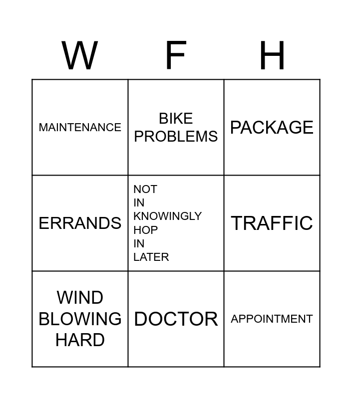 This bingo card has a free space and 15 words: SICK, RAIN, PACKAGE, MAINTENANCE, DOCTOR, APPOINTMENT, FAMILY, CAR BROKE, TRAFFIC, NOT 100%, BIRTHDAY, ERRANDS, WIND BLOWING HARD, BIKE PROBLEMS and PUBLIC TRANSPORTATION PROBLEMS.