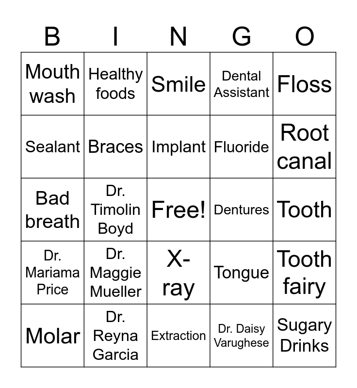 This bingo card has a free space and 38 words: Teeth cleaning, Brush your teeth, Tooth paste, Braces, Tooth fairy, Dr. Maggie Mueller, Implant, Dentist, Floss, Fluoride, Dr. Timolin Boyd, Dental Assistant, Sugary Drinks, Tooth, Sealant, Dr. Mariama Price, Cavity, Smile, Dental Hygienist, Dentures, Mouth wash, Dr. Reyna Garcia, Root canal, Molar, Regular dental exams, Extraction, Patient, Oral hygiene, Bright, Progressive Community Health Centers, Confidence, X-ray, Dr. Daisy Varughese, Healthy foods, Dental chair, Tongue, Bad breath and Sugar.