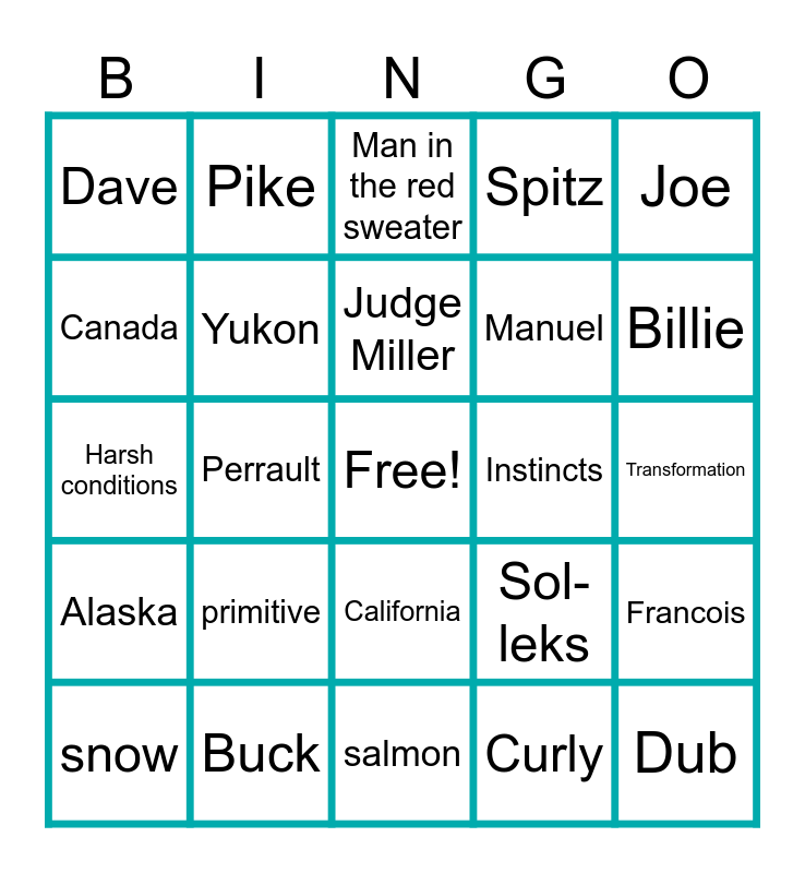 This bingo card has a free space and 24 words: primitive, Buck, Judge Miller, snow, Joe, Dave, Canada, Pike, Instincts, California, Manuel, Harsh conditions, Sol-leks, Francois, Yukon, Curly, Transformation, Man in the red sweater, Billie, Perrault, Dub, Alaska, Spitz and salmon.