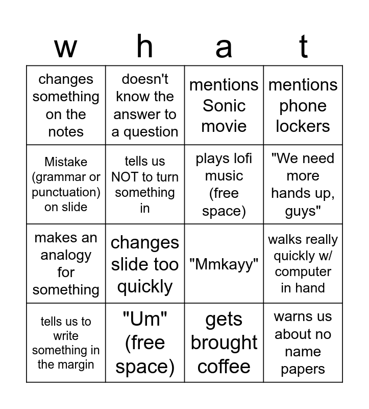 This bingo card has 24 words: Pretends Like He Didn't Mess Up, "Ok, yeah, so..", "We need more hands up, guys", "Does anyone know?" *silence*, Mistake (grammar or punctuation) on slide, changes something on the notes, tells us NOT to turn something in, doesn't know the answer to a question, "Um" (free space), back in his good ol' days, makes an analogy for something, "Mmkayy", irrelevant rant, his gf sits in the classroom, plays lofi music (free space), holds up numbers on his hand, gets brought coffee, mentions Sonic movie, changes slide too quickly, walks really quickly w/ computer in hand, tells us to write something in the margin, warns us about no name papers, mentions phone lockers and talks about how he needs coffee.