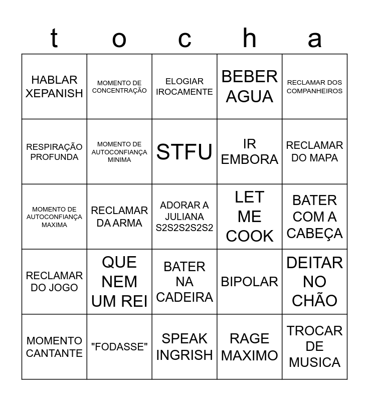 This bingo card has a free space and 24 words: QUE NEM UM REI, "FODASSE", STFU, MOMENTO CANTANTE, RECLAMAR DOS COMPANHEIROS, HABLAR XEPANISH, RESPIRAÇÃO PROFUNDA, MOMENTO DE CONCENTRAÇÃO, LET ME COOK, BATER NA CADEIRA, IR EMBORA, MOMENTO DE AUTOCONFIANÇA MAXIMA, BIPOLAR, DEITAR NO CHÃO, MOMENTO DE AUTOCONFIANÇA MINIMA, RAGE MAXIMO, BATER COM A CABEÇA, ELOGIAR IROCAMENTE, RECLAMAR DO MAPA, RECLAMAR DA ARMA, TROCAR DE MUSICA, RECLAMAR DO JOGO, BEBER AGUA and SPEAK INGRISH.